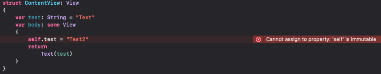 이 ContentView에서 var키워드로 선언한 프로퍼티의 값을 body프로퍼티 내에서 변경하려고 하면 에러가 뜬다.