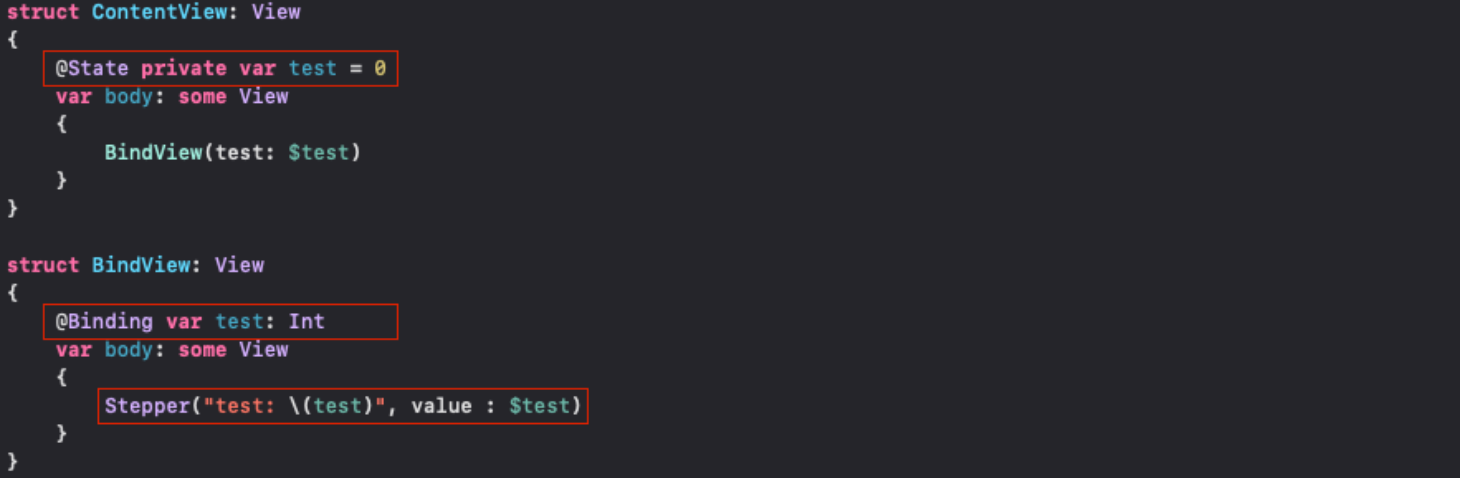 @State는 반드시 주가 되는 뷰에 한 번 선언해주고, 이 프로퍼티를 다른 뷰들에서 사요하기 위해서는 @Binding을 사용한다. 그리고 사용시에는 $를 앞에 붙여주어 Binding변수임을 나타낸다 그리고 뷰 UI에서 특정 동작으로 해당 프로퍼티 값이 변경되는 자리에는 앞에 $를 붙여주고, 코드 내에서 그 값 자체를 출력하여 뷰 UI에 보여주려고 할 때에는 붙이지 않고 그대로 사용한다.