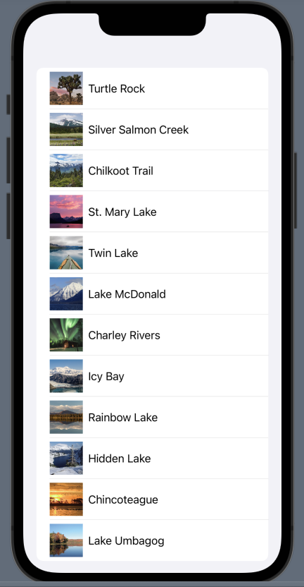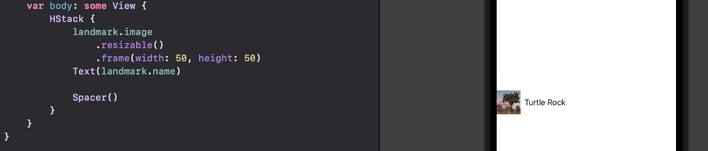row의 UI는 보통 수평으로 컨텐츠가 놓이므로 H스택을 추가해주고 내용으론 landmark의 이미지와 name을 넣어준다