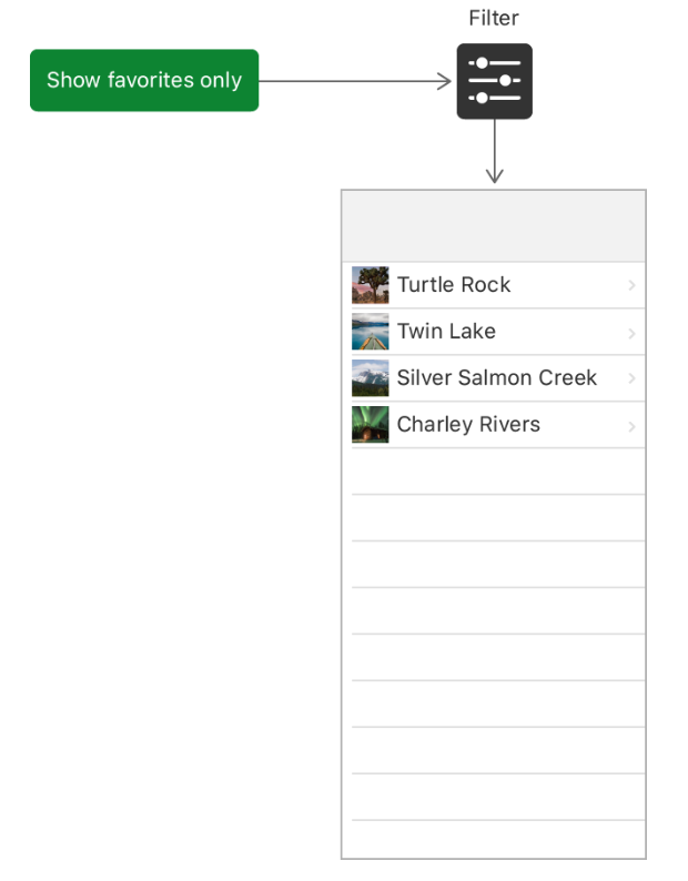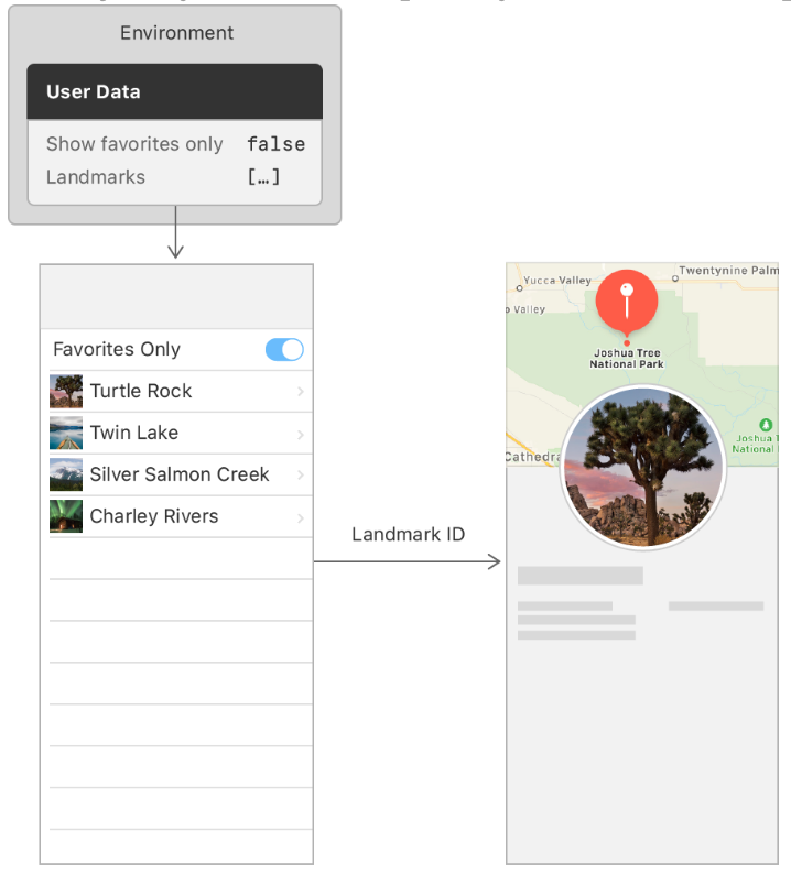 Landmarks앱에서 사용자는 즐겨찾는 장소를 즐겨찾기하고, 즐겨찾기만 표시하도록 목록을 필터링할 수 있다. 이 기능을 만들려면 먼저 스위치를 목록에 추가하여 사용자가 즐겨찾기 한 항목들만 볼 수 있게 한 다음 사용자가 탭 하여 랜드마크를 즐겨찾기로 표시하는 별 모양의 버튼을 추가한다.