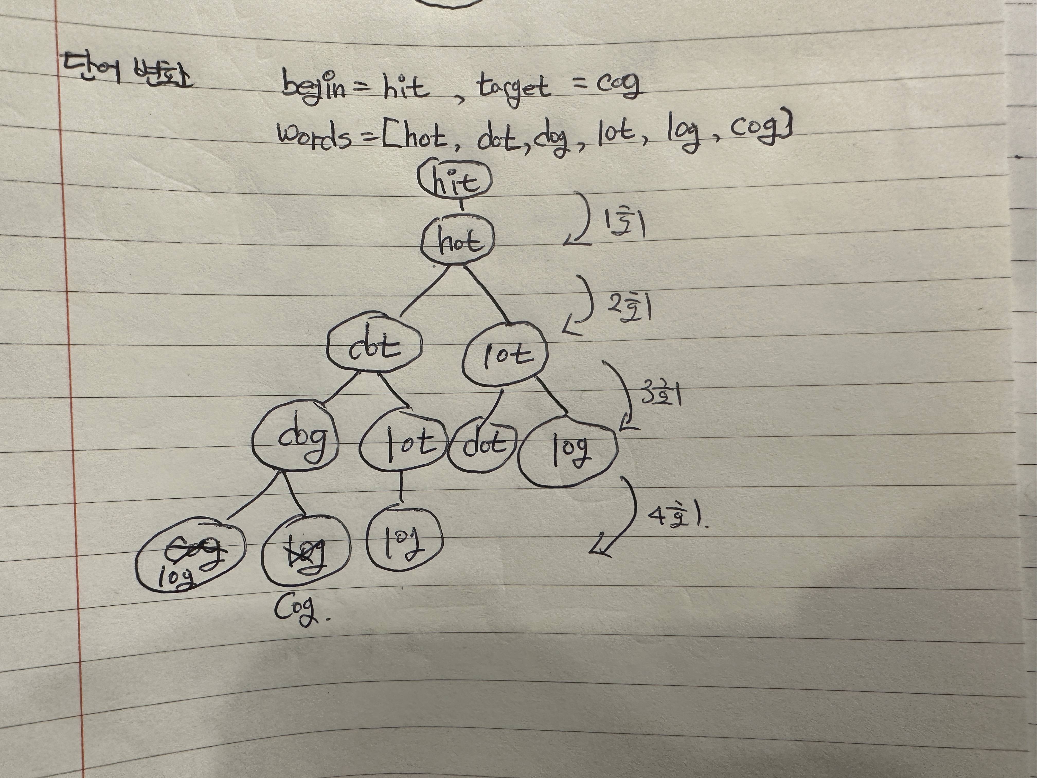 두 개의 단어 begin, target과 단어의 집합 words가 매개변수로 주어질 때, 최소 몇 단계의 과정을 거쳐 begin을 target으로 변환할 수 있는지 return 하도록 solution 함수를 작성해주세요.