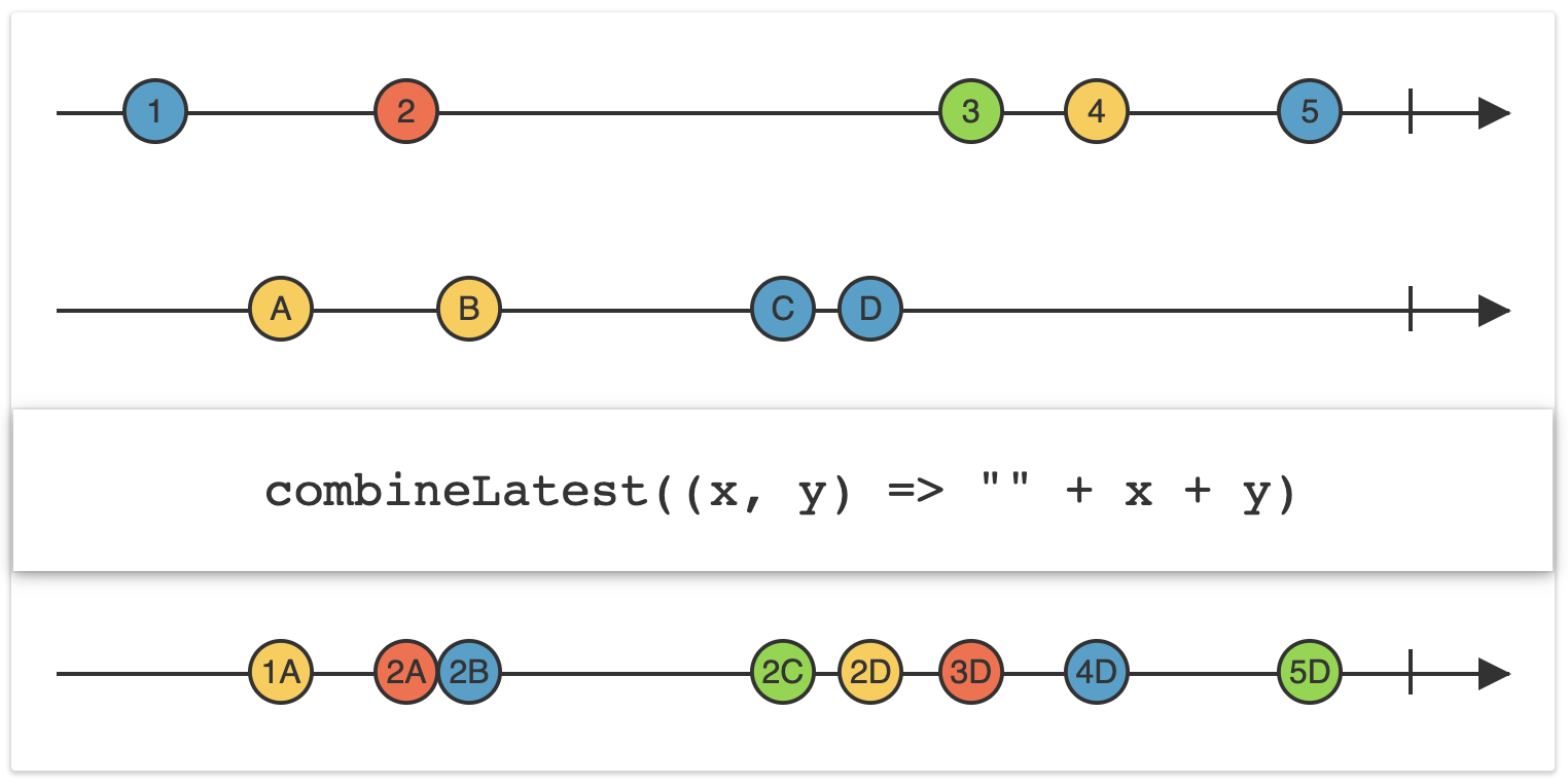 이어서 문자옵저버블이 A를 방출하면 두 옵저버블이 이벤트를 하나씩 방출한것이다. 바로 이 시점에 두 소스 옵저버블이 방출한 최신 이벤트를 대상으로 이너옵저버블의 함수를 실행한다. 여기에서는 숫자와 문자를 연결하게되고 이 결과가 연산자가 리턴한 옵저버블을 통해 구독자에게 전달된다. 그래서 구독자는 1A가 저장된 이벤트를 받는다.
