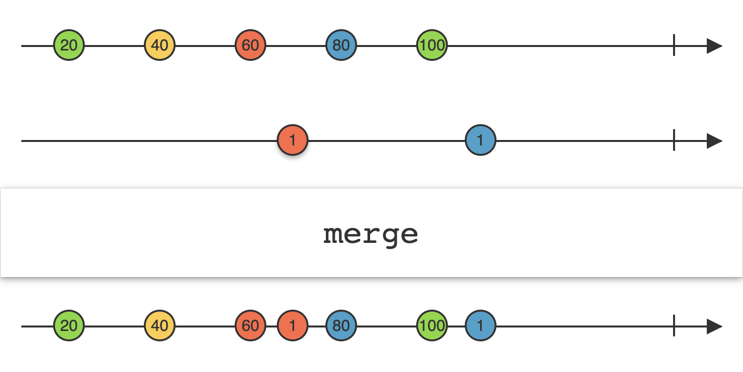 이 연산자는 두개이상의 옵저버블이 방출하는 요소를 병합한 하나의 옵저버블을 리턴한다.