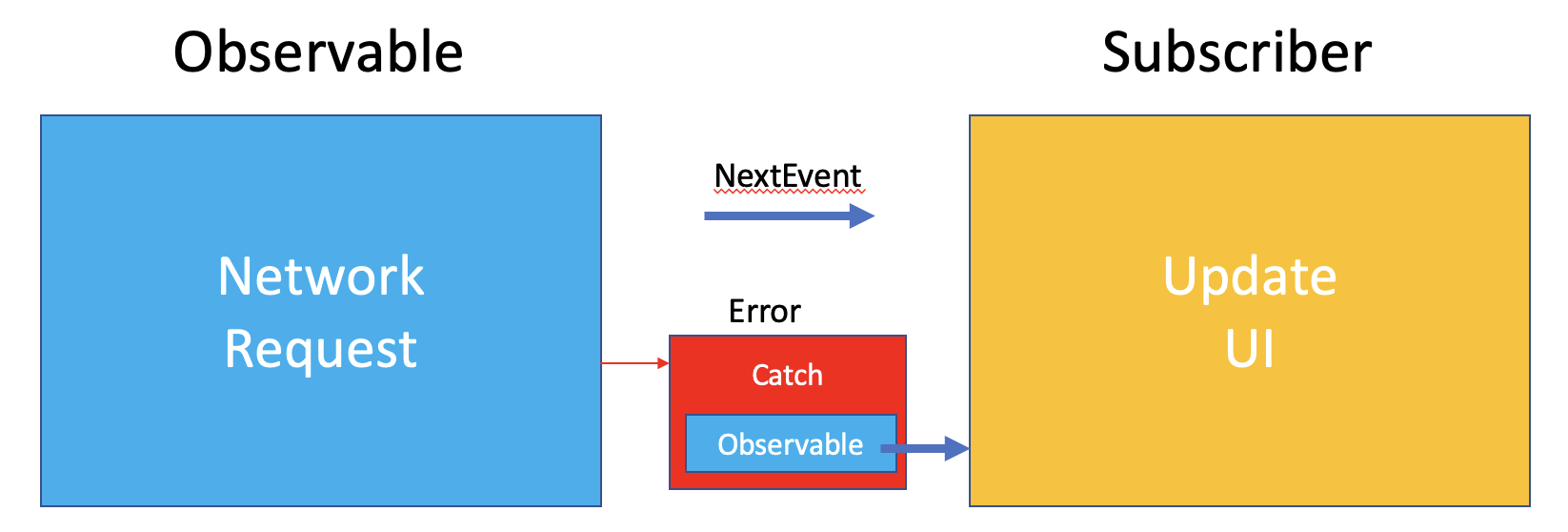 Catch연산자는 NE와 CE는 그대로 구독자에게 전달한다. 반면 옵저버블에서 옵저버블에서 에러이벤트를 방출하면 새로운 옵저버블로 바꿔서 구독자에게 전달한다