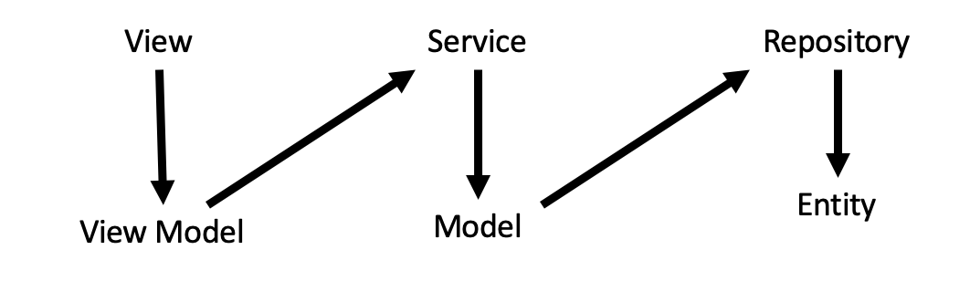 Entity -> Repository -> Model -> Service -> ViewModel -> View(ViewController)