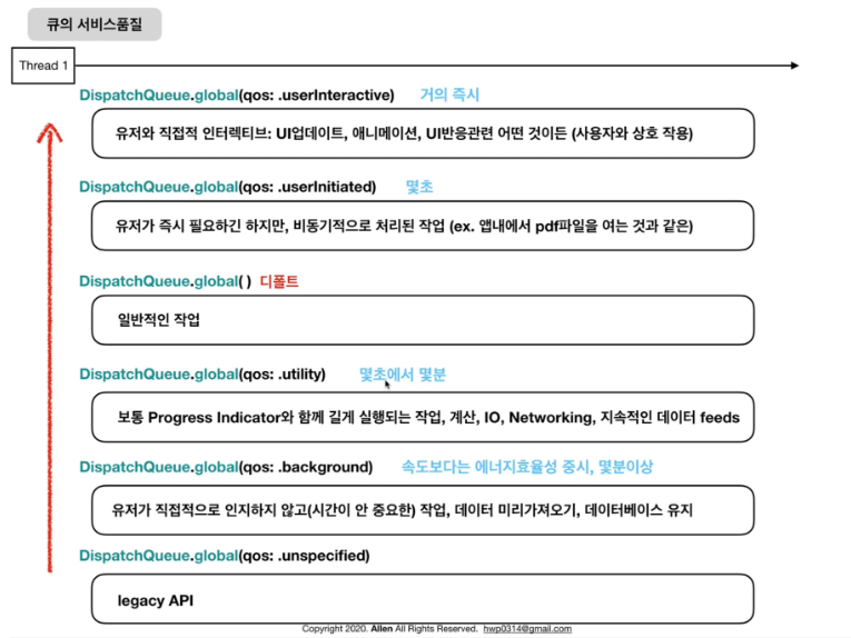• QoS에 따라서 여러개로 나뉜다.  ex) DispatchQueue.global(qos: .utility)