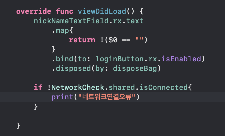 그리고 아래처럼 뷰컨트롤러가 로드되었을때에 네트워크를 체크해 볼 수도 있다.
