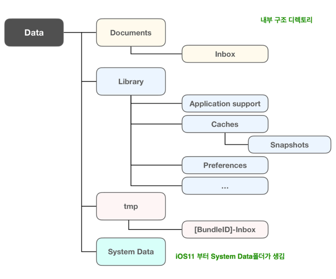 - Data Container : 앱과 유저의 데이터를 담는다. 이 데이터 컨테이너는 다시 서브디렉토리로 나뉘어 많은데이터 들을 나눠 관리한다.