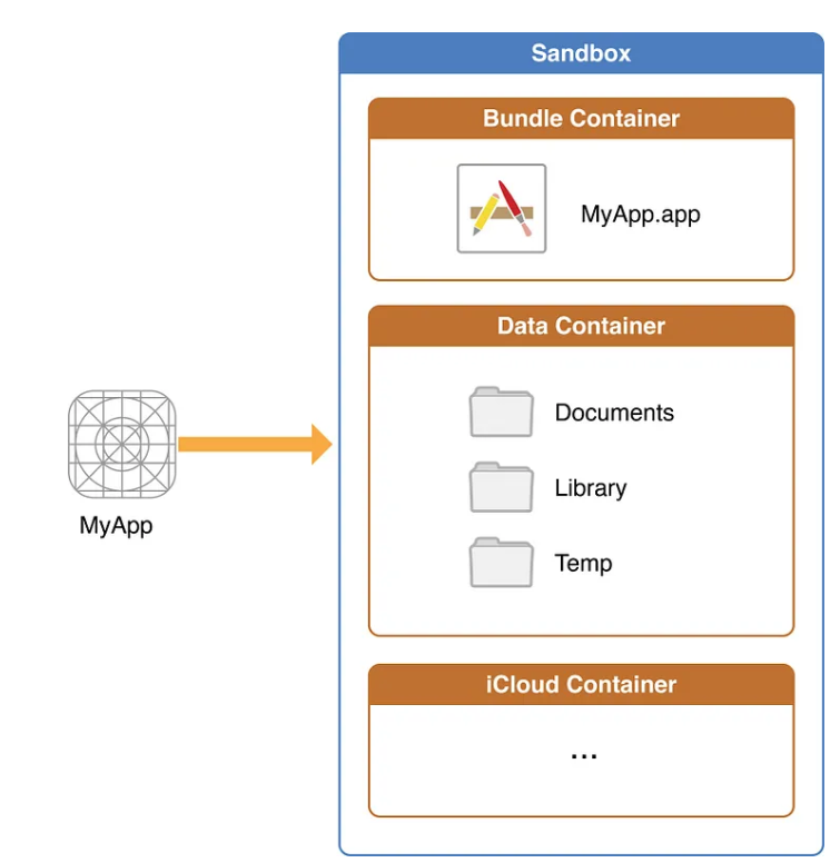 iOS앱은 보안을 이유로SandBox 디렉토리 안에서 파일 시스템과 상호작용할 수 있도록 제한한다. 설치시, 인스톨러는 각각의 역할을 가진 컨테이너 디렉토리들을 샌드박스 디렉토리 안에 설치한다.