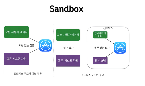 Sanbox: 아이들에게 놀이터 모래사장 안에서만 돌 수 있도록하고, 나올 때는 흙을 털고 나오게하는 것처럼, 내부와 외부를 적절하게 분리시키는 구조라고 할 수 있다. iOS는 기본적으로 앱마다 별도의 파일을 생성하여 공유 되지 않도록 하고 외부러부터 들어온 접근에 대해 보호되는 영역으로 시스템이 부정적으로 조작되는 것을 막는 보안형태를 띄고있다.