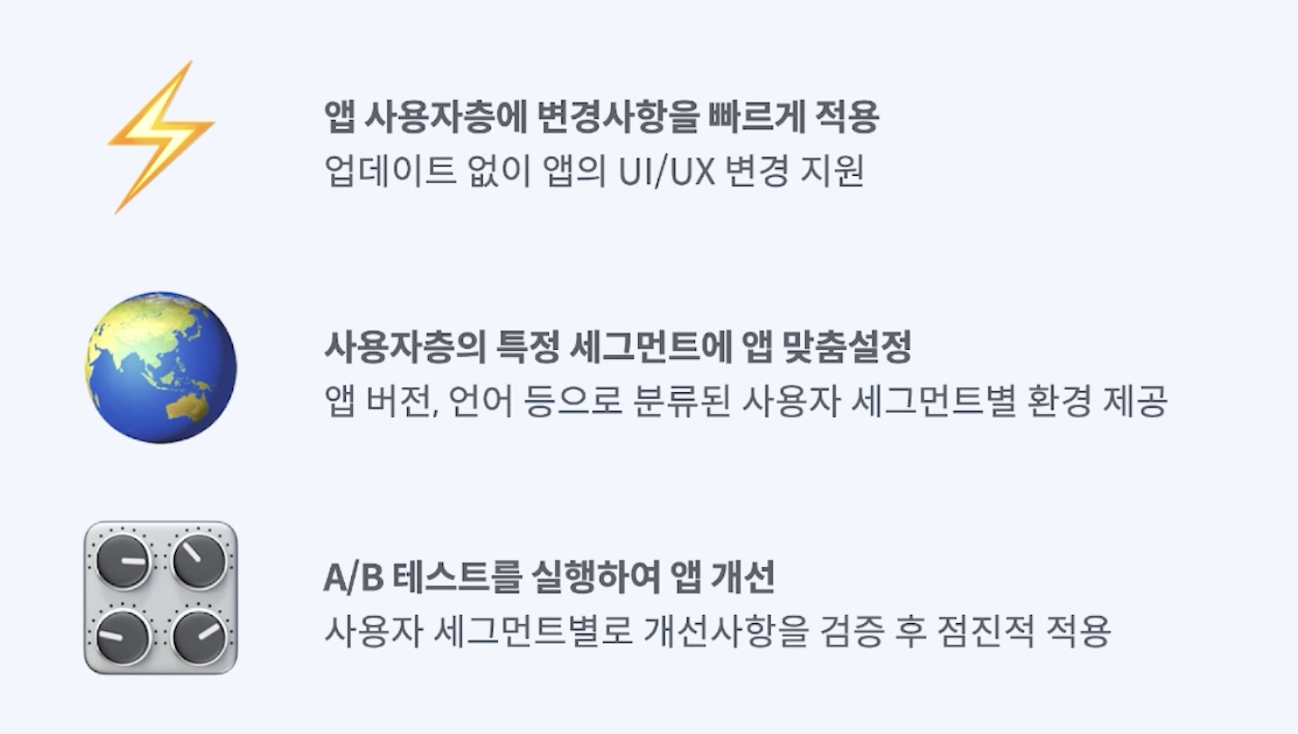 앱 업데이트 없이 몇 분 내에 또는 사용자가 앱을 재실행 했을 때 바로 변경사항 반영이 되게된다.