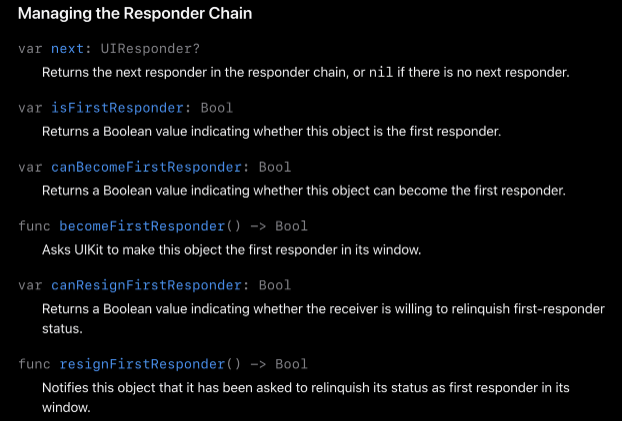 이 메서드들은 responder chain을 관리해주는 메서드들이다. 간단하게 설명하자면 아래와 같다.