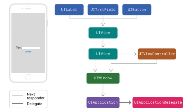 Responder객체는 UIResponder의 인스턴스이다. 그리고 이 인스턴스가 UIKit에서 이벤트 처리의 중추 역할을 한다. UI의 많은 객체들 UIApplication, UIView, UIViewController같은 객체들이 모두 Responder이기도 하다. 이벤트가 발생하면 UIKit은 이벤트를 Responder객체에게 전달해서 처리한다.