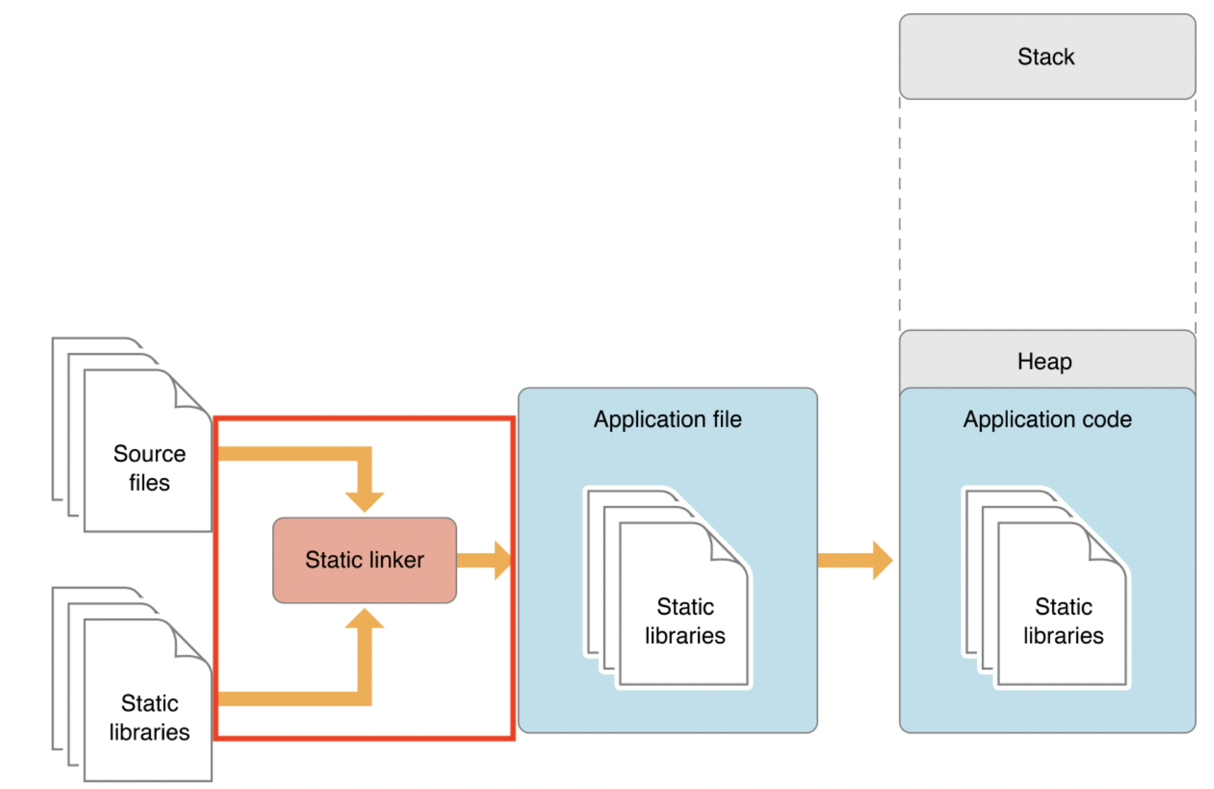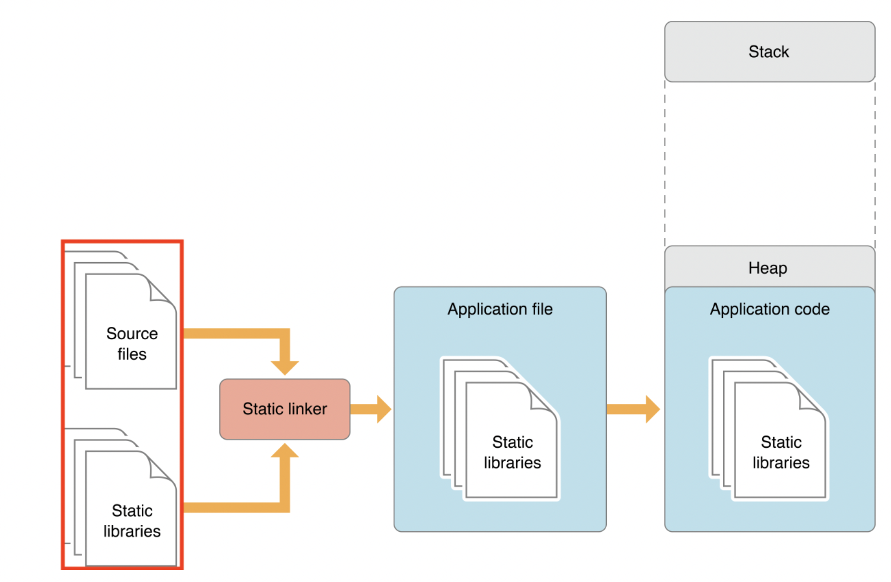 이 때 Static linker를 사용해 앱의 Source files와 Static Libraries를 merge하게된다.