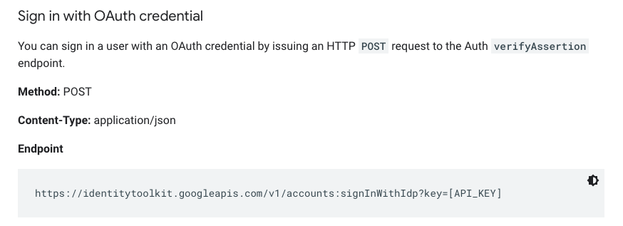 curl 'https://identitytoolkit.googleapis.com/v1/accounts:signInWithIdp?key=[API_KEY]' \