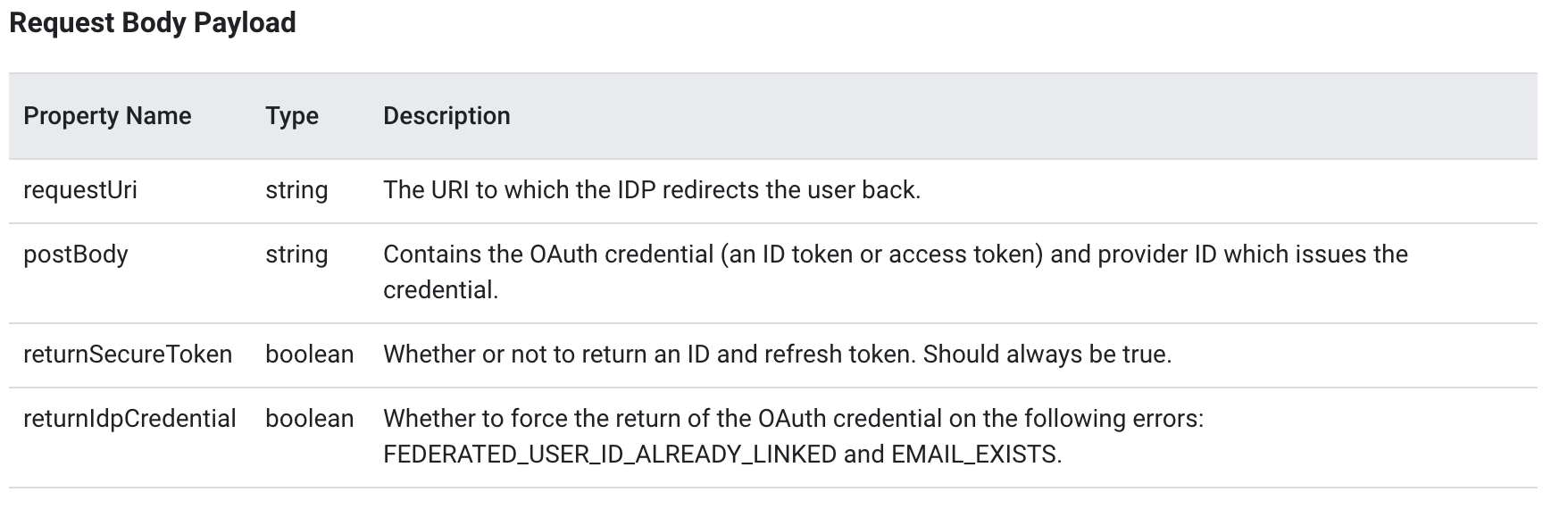 - returnIdpCredential: FEDRATED_USER_ID_ALREADY_LINKED and EMAIL_EXISTS 오류가 발생할 경우 OAuth 자격증명을 강제로 반환할지 여부를 나타낸다.