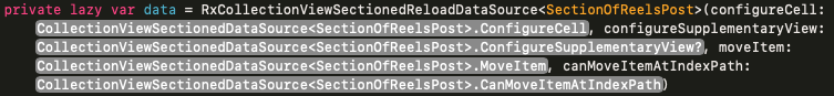 private lazy var dataSource = RxCollectionViewSectionedReloadDataSource<SectionOfReelsPost>(