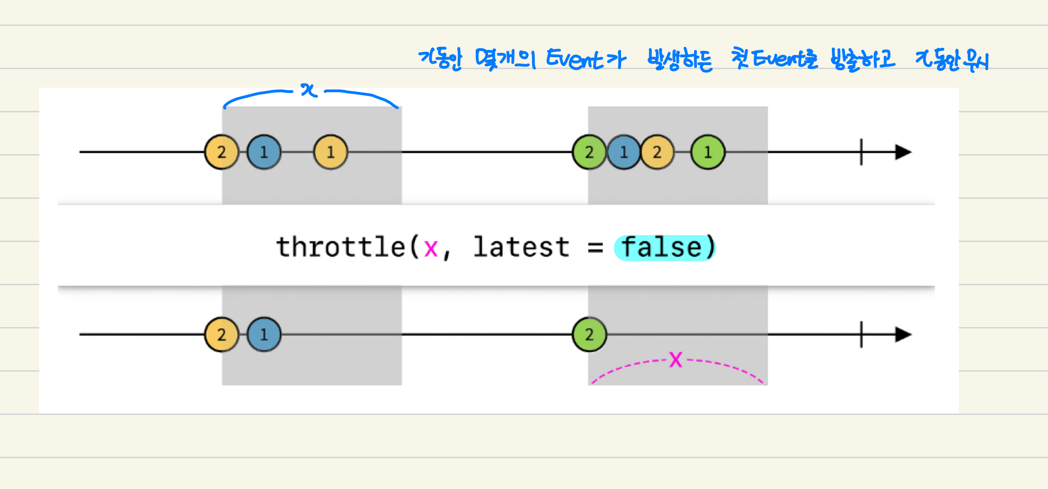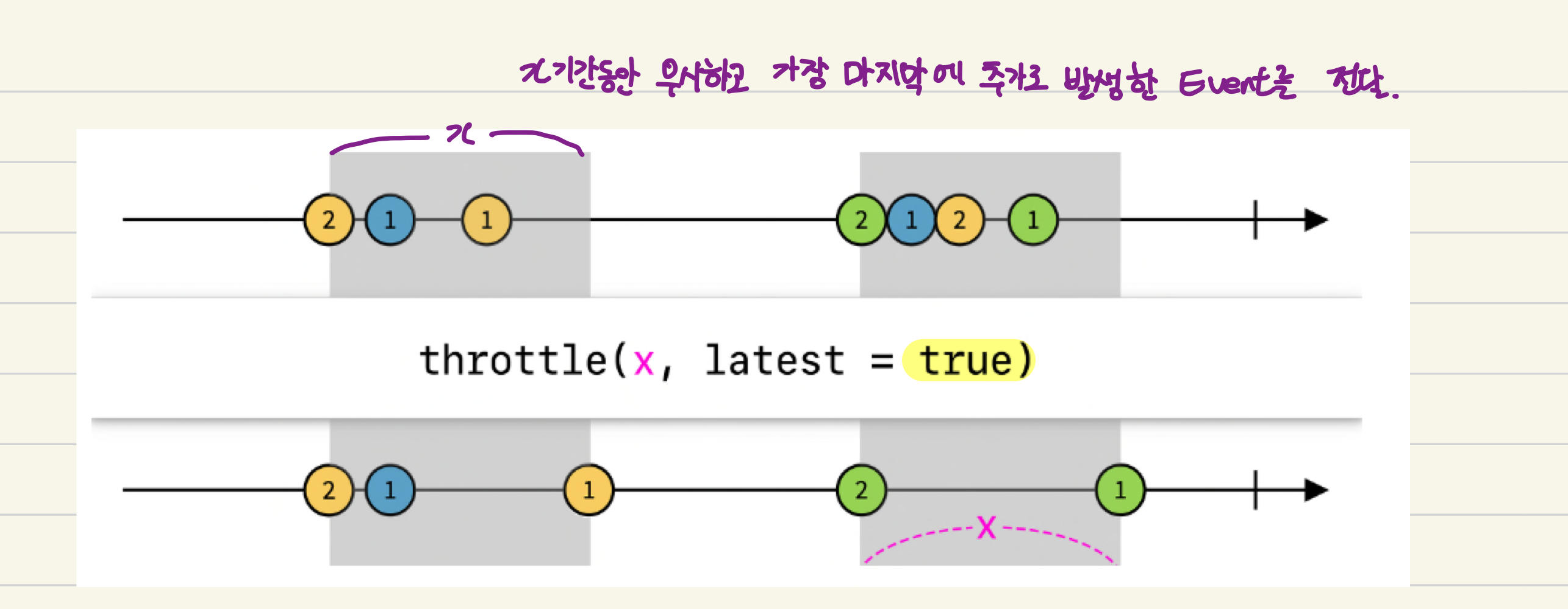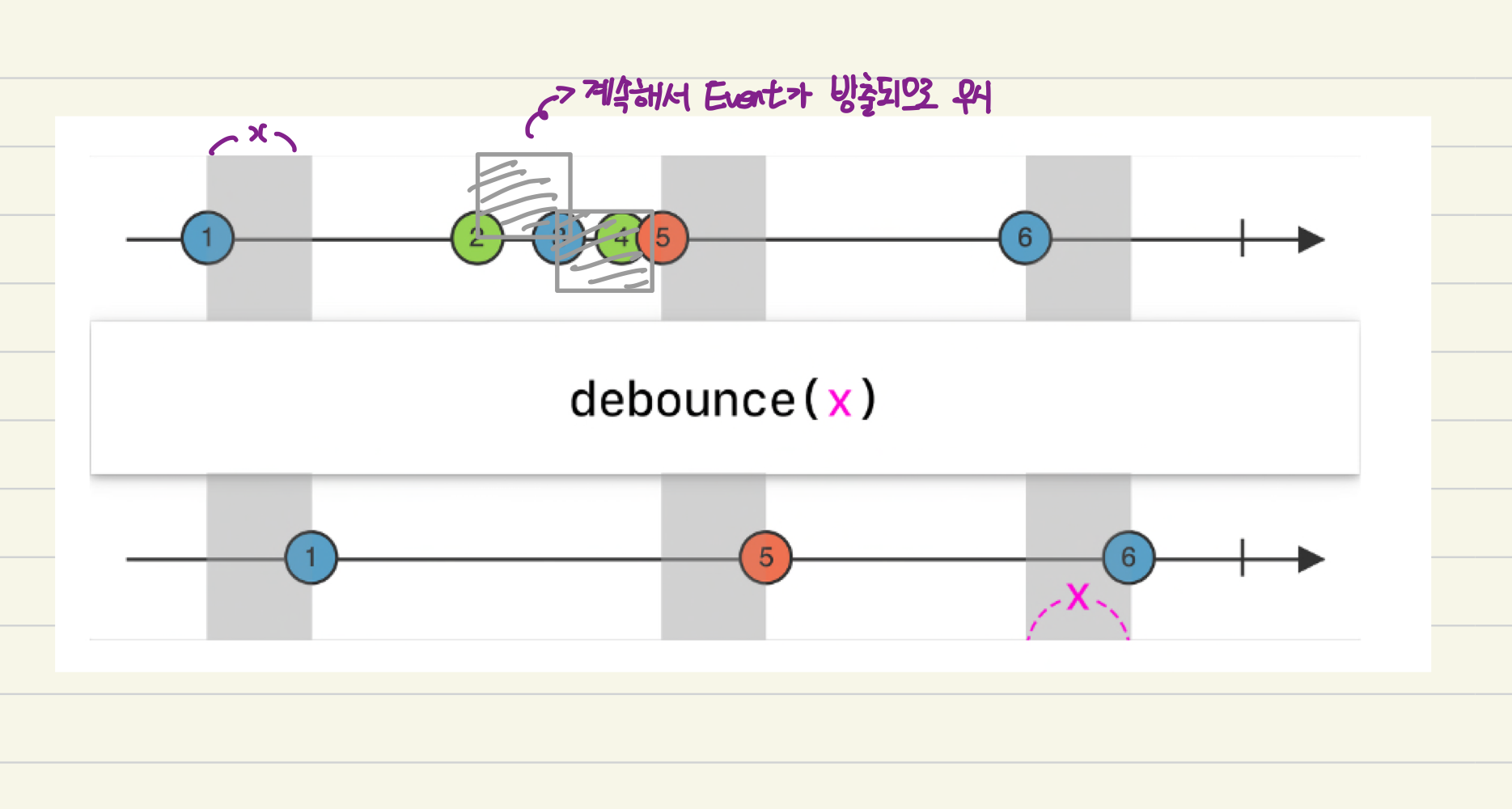 - Debounce는 반대로 x동안 무시하다가 마지막으로 발생한 이벤트를 방출한다.