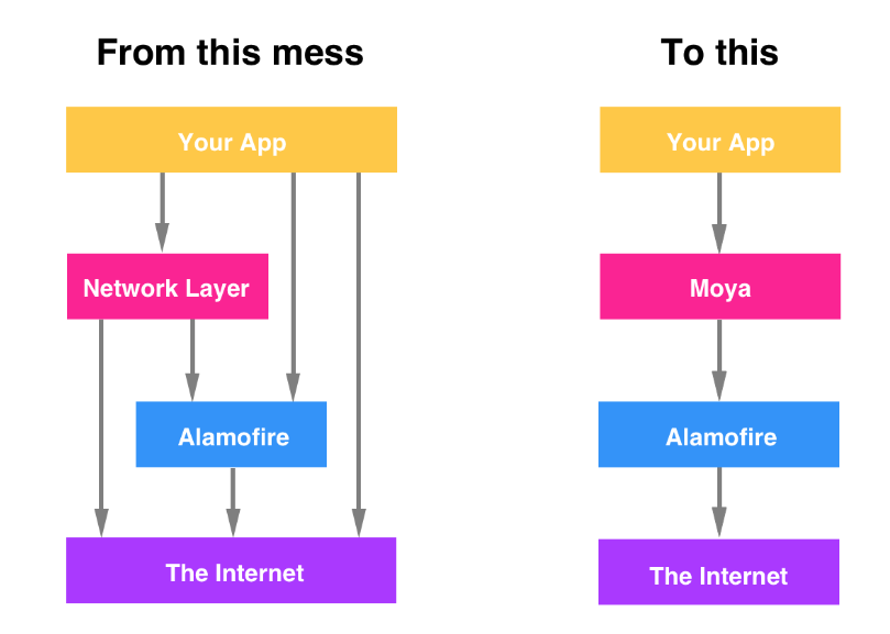하지만 유지보수와 유닛테스트가 힘들다는 단점이 있어 이를 조금 더 추상화시켜 탄생한 것이 Moya라고 한다.