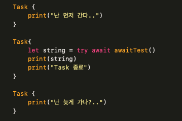 awaitTest는 "Task.sleep" 라는 비동기 코드를 우선 실행시키고 await한다.