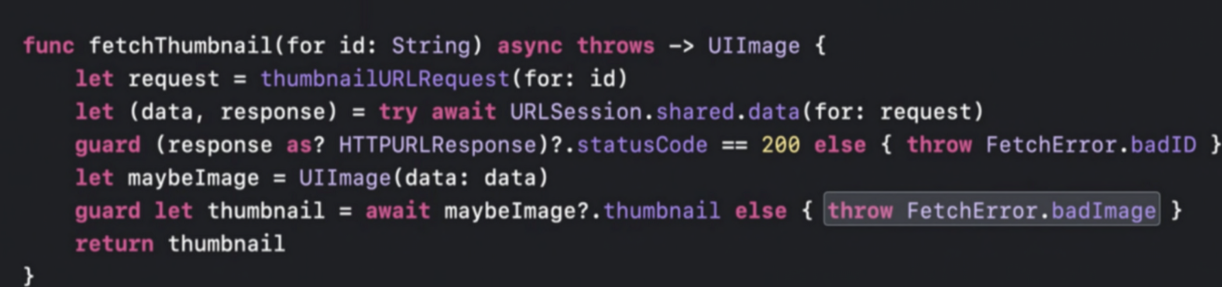 - 에러를 던질 수 있는 경우 async throws 순서로 적는다.