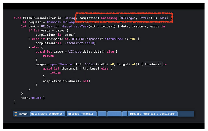 또한 Codeblock이 한번에 처리되지 않을 수 있다는 것을 인식해야 하므로, 다른 작업들이 먼저 실행되는 동안 앱의 상태가 변할 수도 있다는 것을 인지해야합니다.