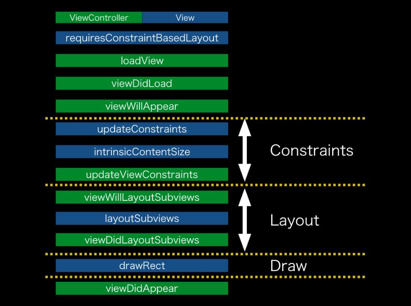 layoutSubViews()는 하위 뷰들의 레이아웃을 재조정합니다. 또한 draw()는 드로잉 사이클에 그려야할 컨텐츠들을 동시에 그리고 적용시킵니다.