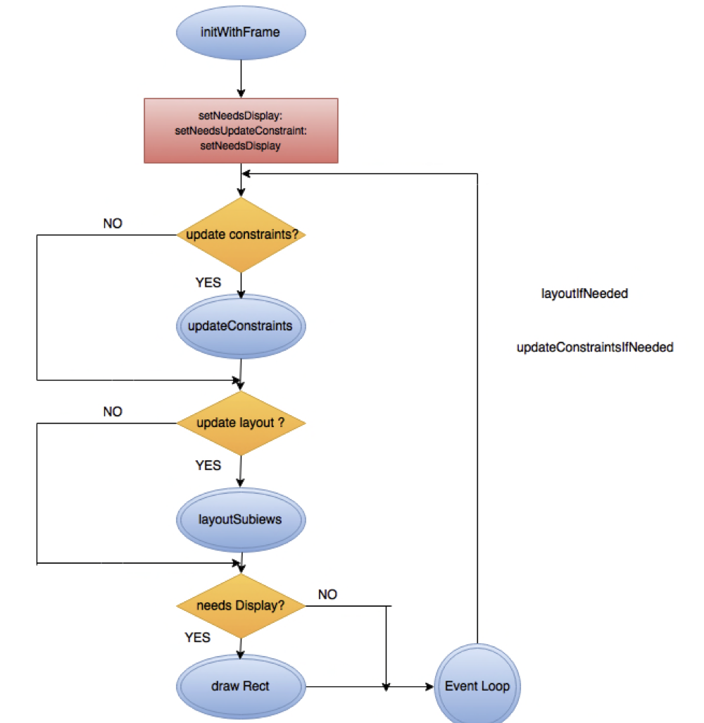 main run loop에서 이벤트가 처리되는 과정에서 버튼을 누르면 크기나 위치가 변화하는 애니메이션 같이 layout이나 position 값을 바꾸는 핸들러가 실행될 수 있습니다. 이런 변화는 즉각적으로 반영되는 것이 아닙니다. system은 layout, position이 변경되는 view를 확인합니다.