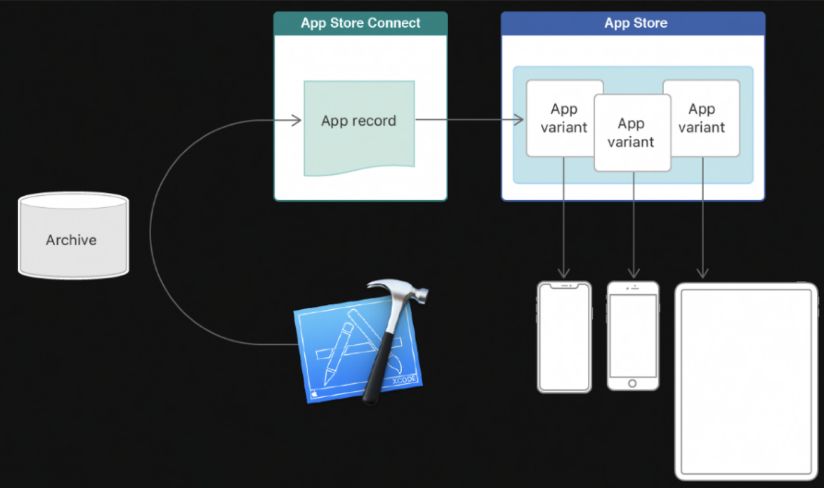 그림에서 App variant라고 생각하면 되는데, 앱스토어 커넥트에 업로드하게되면 앱스토어는 앱이 지원하는 기기 및 운영체제 버전에 따라 변형(variants)을 생성하고 제공합니다.