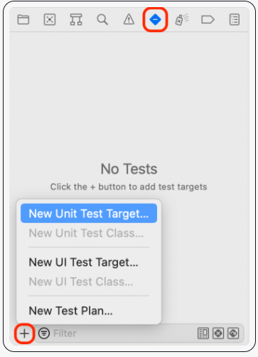 테스트 네비게이터는 테스트 작업을 쉽게하는 방법들을 제공합니다. 이것을 사용하여 테스트 대상을 생성하고 앱에대한 테스트를 실행하게 됩니다.