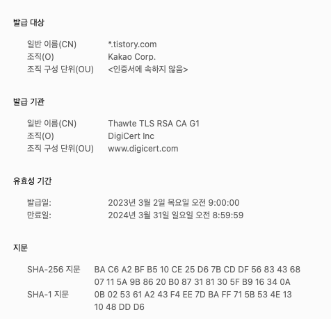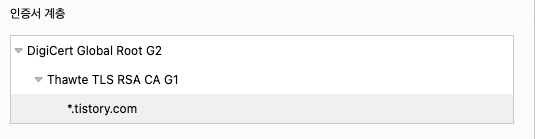Tistory의 인증서 계층을 보면 tistory는 Thawte TLS RSA CA G1(Intermediate CA)로부터 인증서를 발급받았습니다.