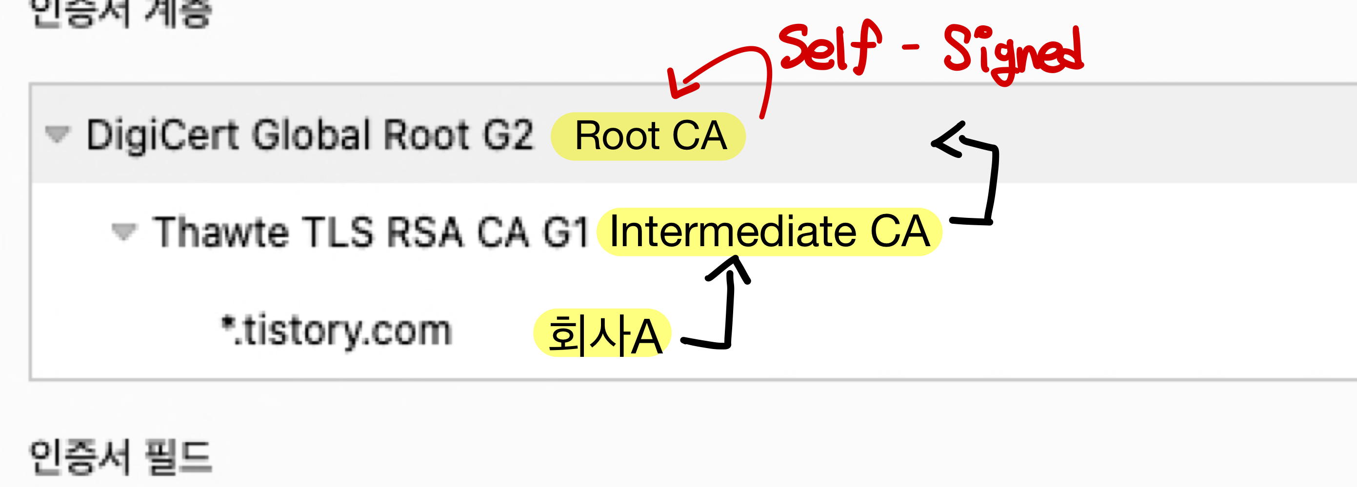 Tistory의 인증서 계층을 보면 tistory는 Thawte TLS RSA CA G1(Intermediate CA)로부터 인증서를 발급받았습니다.