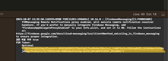 앱을 실행하면 콘솔로 디바이스 토큰이 도착하게됩니다.