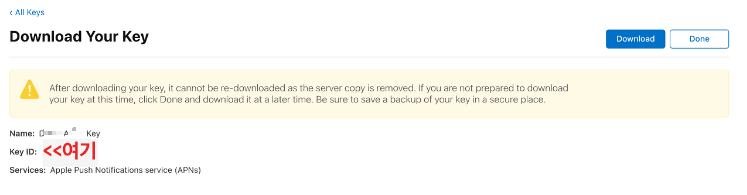여기서 우측에 DownLoad버튼을 클릭하면 ".p8" 확장자의 파일이 다운로드됩니다.