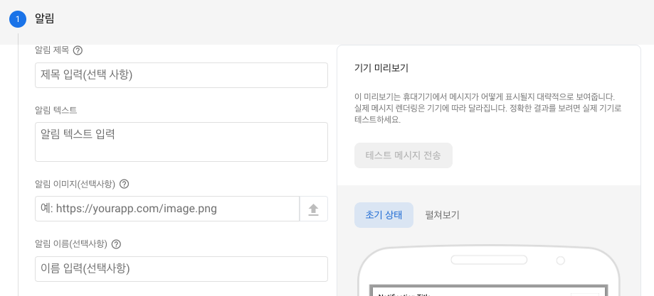우측 기기 미리보기의 테스트메시지 전송을 클릭합니다.