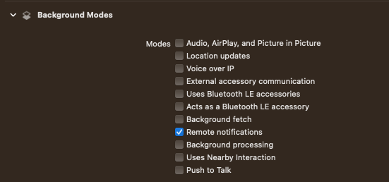 Background Modes에서 Remote Notifications를 체크해줍니다. 체크 후 바로 해제된다면 시뮬레이터를 종료하고 체크해줍니다.