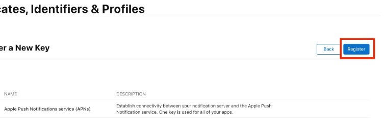 키 이름은 원하는대로 생성하고, Apple Push Notifications 를 체크합니다.