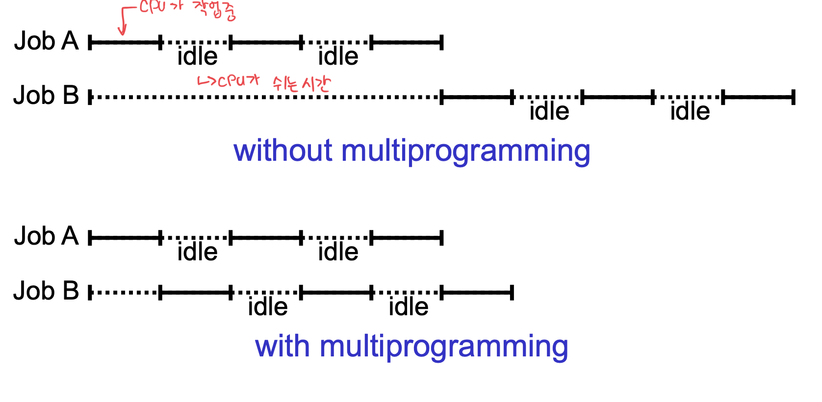 다중 프로그램을 실시하지 않을 경우 A프로그램이 끝나야 B프로그램을 처리할 수 있으며, A가 쉬는 시간이 발생하면 그저 시간을 낭비하게 되는것이다.