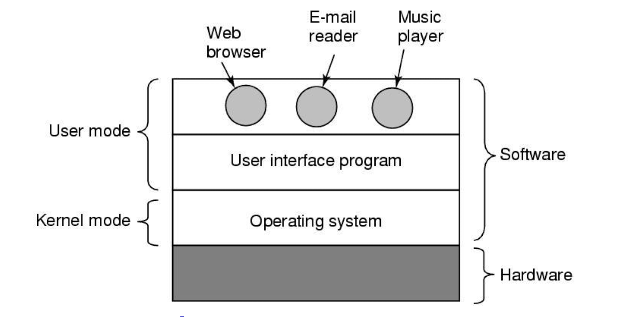 컴퓨터 시스템은하드웨어 위에 운영체제가 작동한다 그 운영체제는 User interface frogram이 작동하며 그 위에 우리가 사용하는 프로그램들이 동작하는 식으로 운영된다