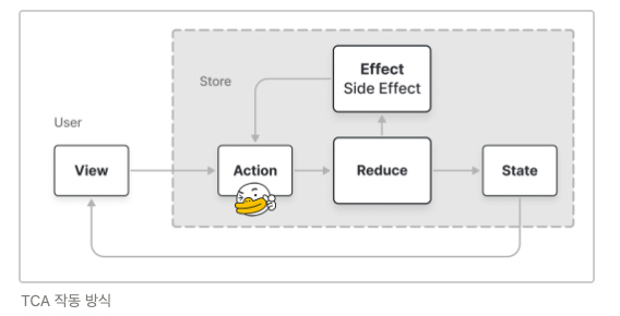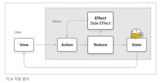 Effect는 직접 state를 변경하진 않습니다. 하지만 TCA에서 Effect는 사이드 이펙트와 같은 비동기 작업도 순수함수 방식으로 처리할 수 있도록 설계되었습니다.