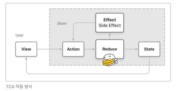 Effect는 직접 state를 변경하진 않습니다. 하지만 TCA에서 Effect는 사이드 이펙트와 같은 비동기 작업도 순수함수 방식으로 처리할 수 있도록 설계되었습니다.