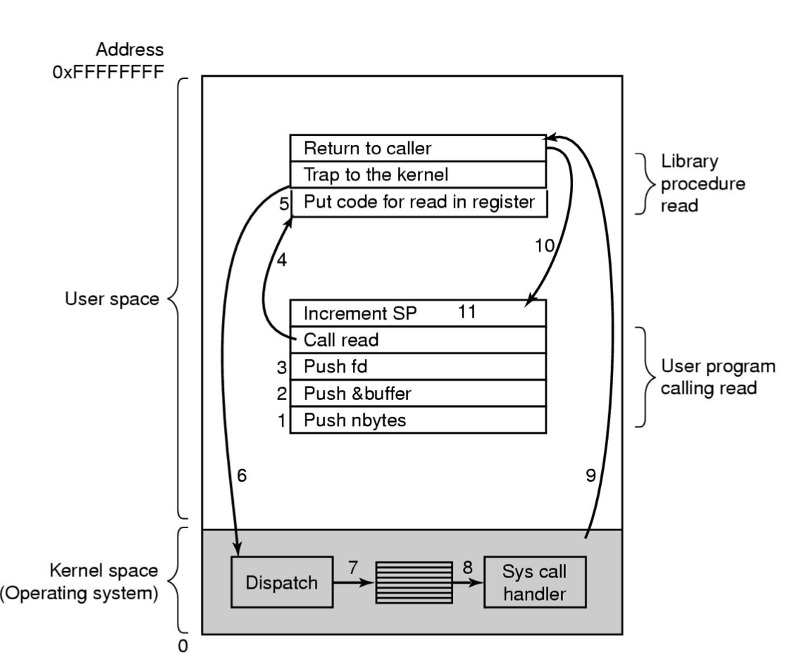 read 명령어는 System call을 하는 명령어가 아닌 이유이다. 라이브러리의 read를 실행시키면 read 명령어는 User가 생성한 read 명령어의 데이터를 레지스터로 보내게되고 Library procedure read를 통해 Kernel space로 점프하게 된다.