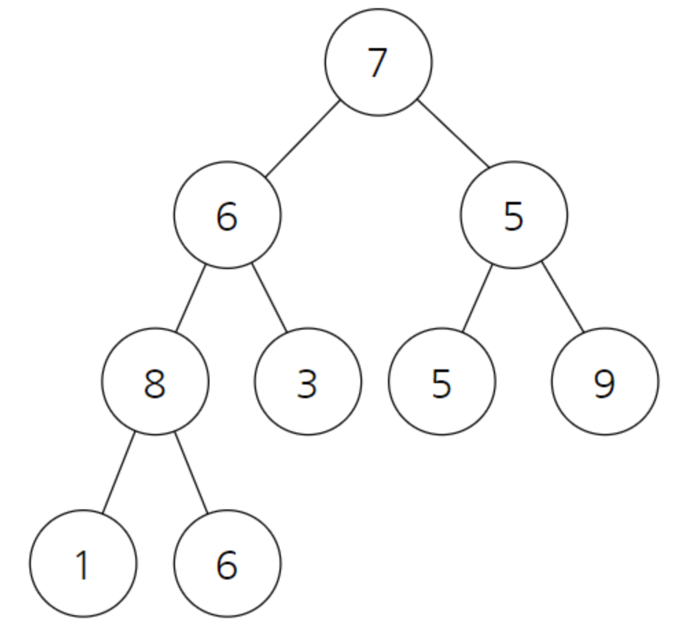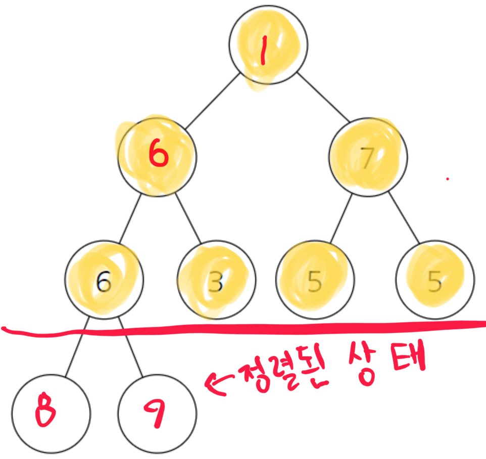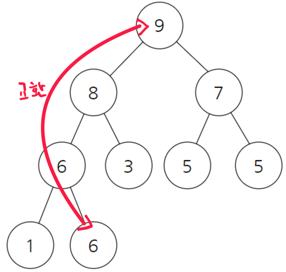 또 자식 노드와 교환이 이루어진 이후에도 여전히 자식 이 존재하는 경우 또 두 자식중에서 더 큰 자식과 자신의 위치를 바꾸어야 한다.