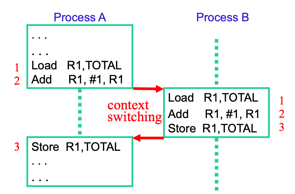 만약 프로세스A의 Add명령어가 실행되고 Store가 실행되지 못한 채 스케쥴러에 의해 CPU의 사용권이 A에서 B로 넘어가면서 레지스터 값들을 메모리에 저장했다고 가정할 경우 문제가 생긴다.