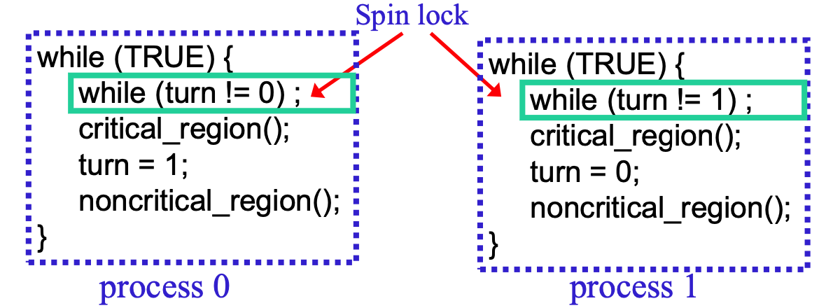 프로세스간 번갈아가며 critical region에 진입시키겠다는 개념이다. 이는 Pure Software Approach로 Busy Wating방식이다.