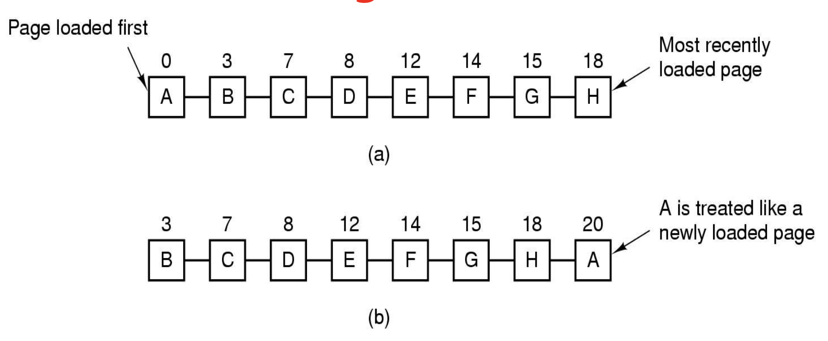 그림 (a)에서 가장 오래된 페이지는 A이다. 하지만 교체전략에 대입 후 새로 들어온 페이지처럼 리스트의 마지막으로 갔다.