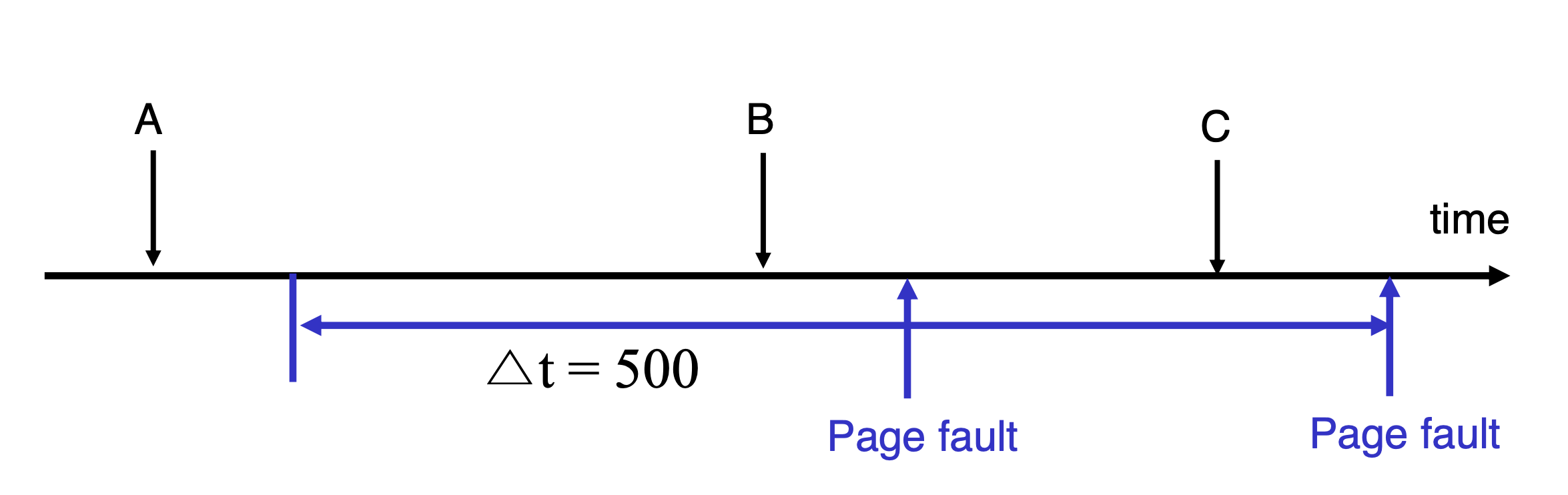 마지막 page fault가 일어난 시점에서 보면 500내에 B, C가 참조되었으므로 Working set = B, C