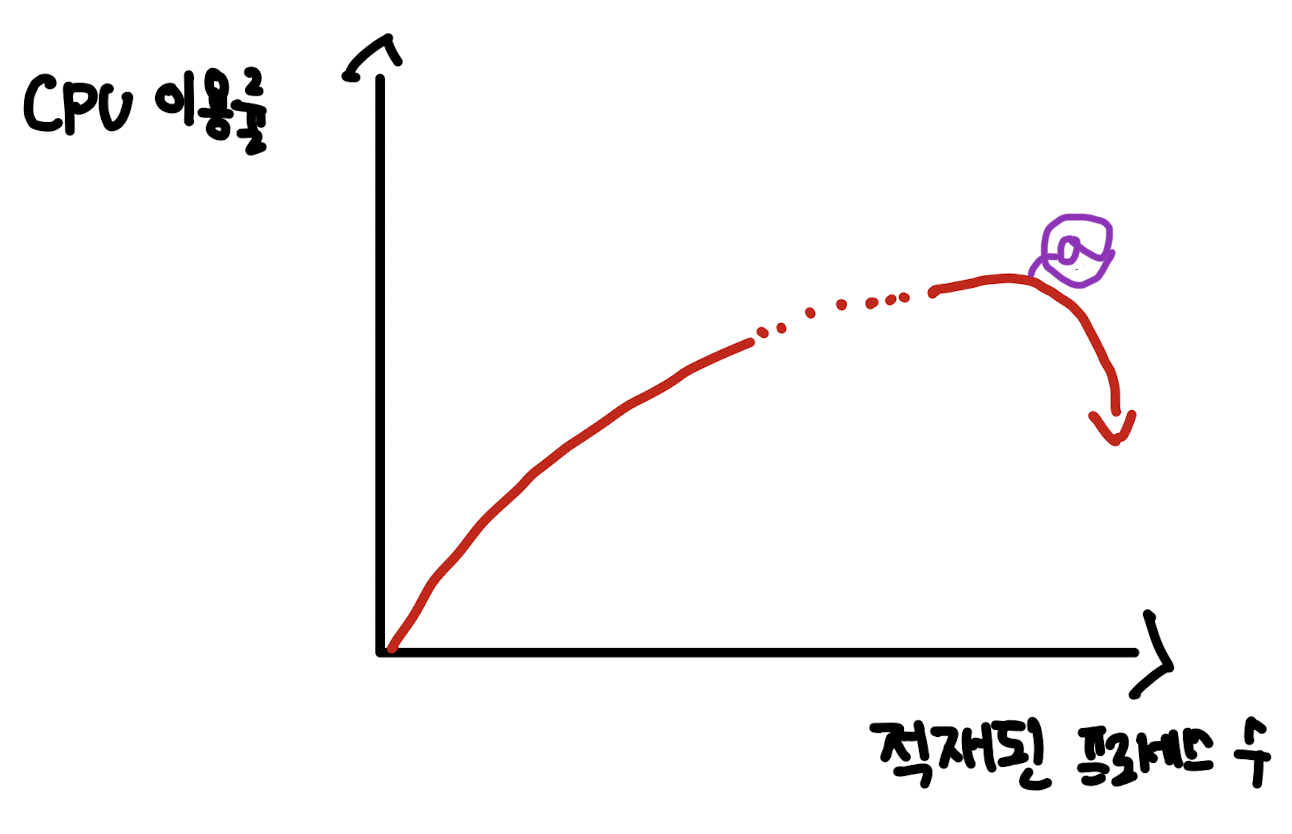 하지만 프로세스를 메모리의 용량을 초과할 정도로 계속 적재하다보면 어느순간 성능이 저하되는 순간이 온다. = Thrashing 발생