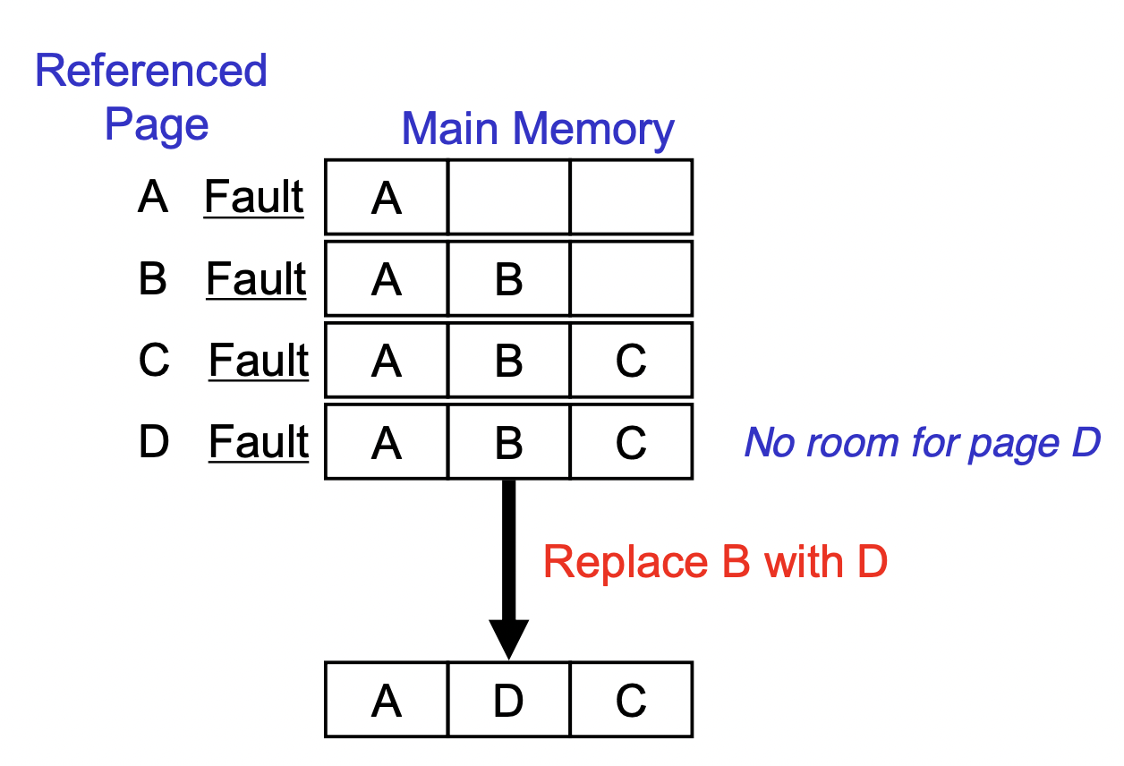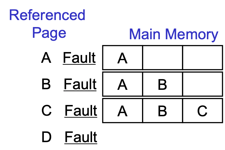 1. 페이지 A를 첫 번째 메모리에올린다. Fault가 발생하는데, 메모리에 처음 올리는 경우 발생한다.