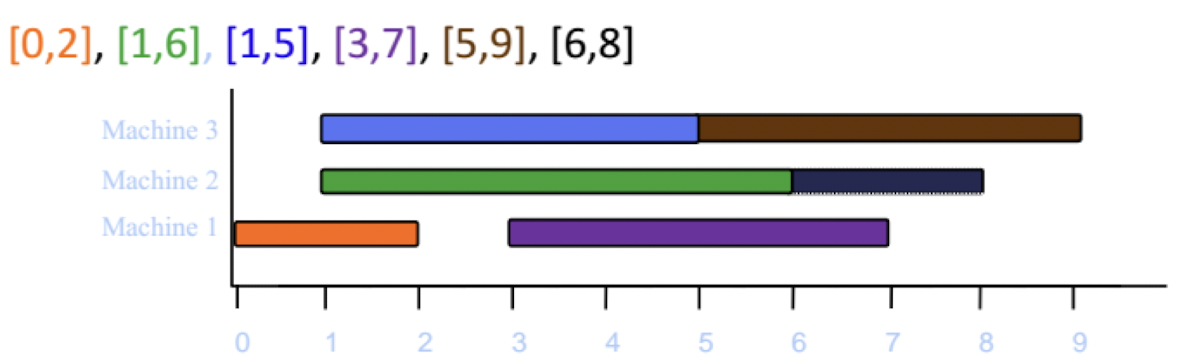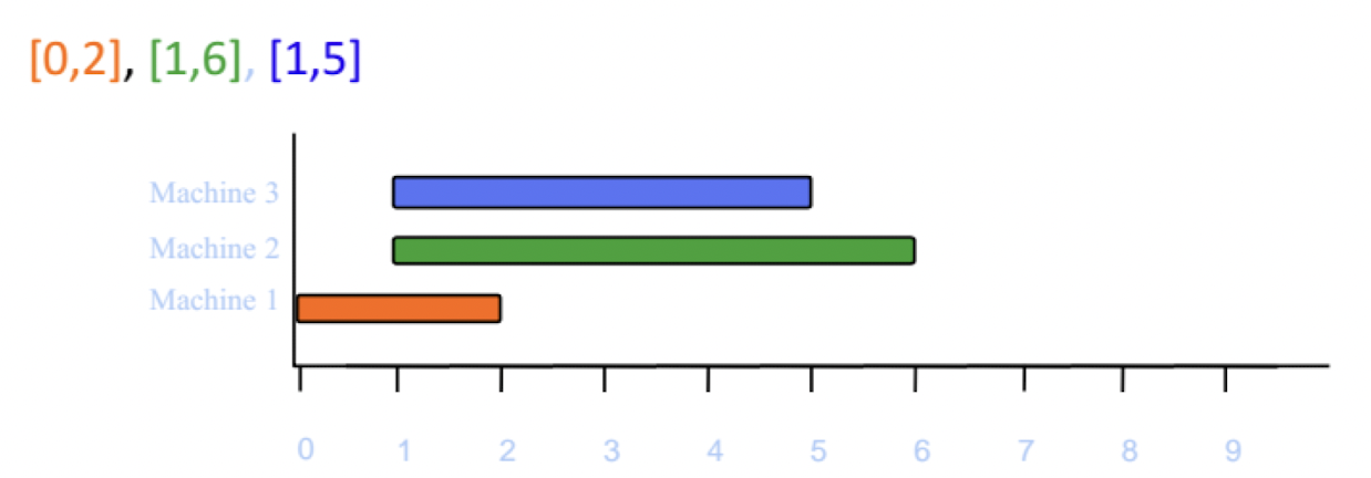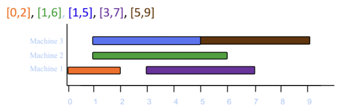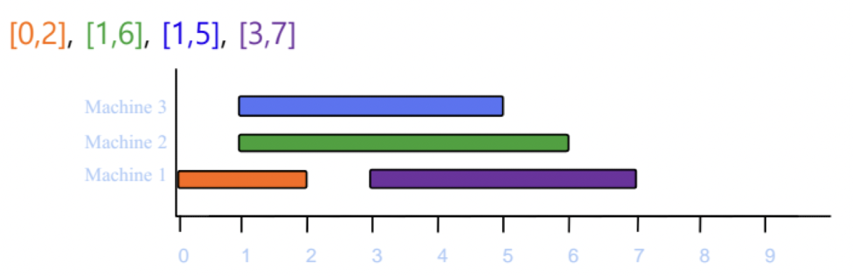 시작시간에 따라 정렬된 순서대로 배정을 하는데, 먼저 생성된 기계 순서대로 t가 배치될 수 있는지 확인하고, 배치될 수 있는 기계가 없을 때 기계를 생성한다.